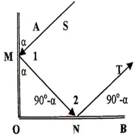 Угол между зеркалами ОА и ОВ равен 90о. Луч света, падающий на зеркало ОА под углом, отражается от него, а затем отражается от зеркала ОВ. Доказать, что падающий и отражённый лучи параллельны.