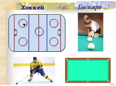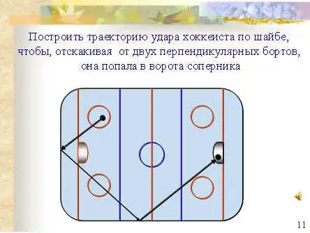 Применение данного свойства прямоугольного треугольника не ограничивается приведённым примером, не только лучи света отражаются от зеркальных поверхностей. По тем же законам происходит и отскок, например, шайбы при передаче другому хоккеисту через два борта; опытные бильярдисты также используют при игре данный приём. Очень важно при игре в хоккей рассчитать правильность броска и этим занимаются тренеры. Мы с вами сейчас побываем в роли тренера. Ваша задача построить в тетради, траекторию удара хоккеиста по шайбе, чтобы, отскакивая от двух перпендикулярных бортов, она попала в ворота соперника. (Слайд 11)