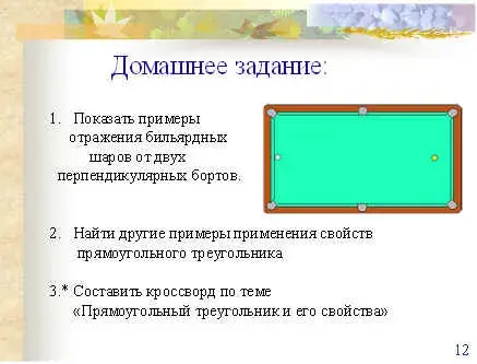 1) В тетрадях необходимо показать примеры отражения бильярдных шаров от двух перпендикулярных бортов.