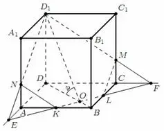 Решение. Построение сечения видно на рис. 4, где K и L - середины сторон AB и BC основания призмы, E и F - точки пересечения прямой KL соответственно с продолжениями сторон DA и DC. Сечением является пятиугольник KLMD1N, площадь которого можно найти. Можно сначала вычислить площади треугольников EFD1 и LFM,а потом от площади первого треугольника вычесть удвоенную площадь второго (поскольку треугольники LFM и EKN равны). Этот способ решения вы разберете дома.