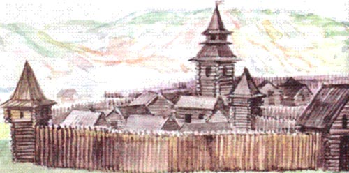 (отмечаю на карте флажками названные пункты и на примере макета, объясняю, что такое острог - деревянная крепость, стены которой делали из заострённых брёвен). <Рисунок