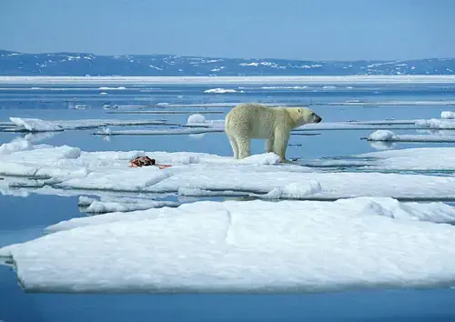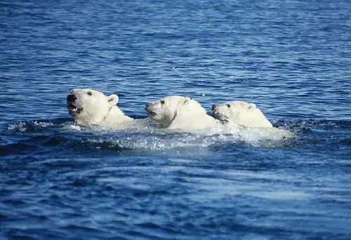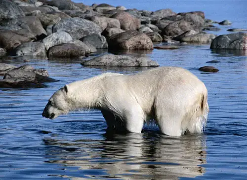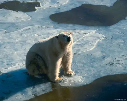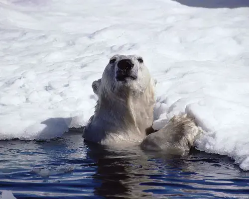Хотя медведь и не живет постоянно в воде, но его жизнь неразрывно с океаном. Белый медведь - обитатель Крайнего Севера. В основном он мясоед пища, прежде всего тюлени, овцебыки, лемминги, рыба, а также киты и моржи. Его туловище вытянуто в длину до 2,50 м., шея длинная и тонкая, голова длинноватая и узкая, уши маленькие. Толстый мех и слой жира под кожей защищает тело от холода. Так как белые медведи хорошо плавают, у них между пальцев есть небольшие перепонки кожи. У медведицы в декабре появляются детеныши, обычно два. Белые медведи живут до 25 лет. Обитают они на южной границе ледовой зоны Северной Азии и Северной Америки, на материке встречается редко.