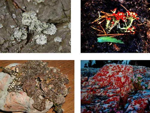 "Размножаются лишайники вегетативно, бесполым и половым путем. Наиболее часто наблюдается вегетативное размножение. Оно осуществляется либо отделением кусочков слоевища, либо с помощью специальных образований, состоящих из клеток гриба и водоросли, которые легко разносятся при помощи ветра и воды. При споровом и половом размножении размножается только гриб. Споры распространяются ветром и, попав в благоприятные условия, прорастают. Но новый лишайник сформируется только в том случае, если гифа встретит подходящую водоросль. В противном случае она погибает".