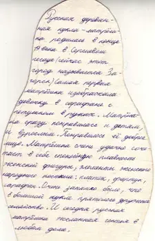 Учитель: Сейчас вы будете писать короткое сочинение. Нужно в художественном стиле дать описание матрёшки. Возьмите карточки. Слева на карточке есть план сочинения, прочтите его.