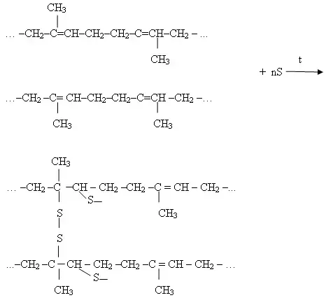 Натуральные и синтетические каучуки используют преимущественно в виде резины. Для получения резины каучук вулканизируют. Какова же химическая сущность процесса вулканизации? При нагревании каучука с серой отдельные полимерные цепи «сшиваются» между собой за счёт образования дисульфидных мостиков по месту разрыва двойной связи (Приложение 1, слайды 16 и17):