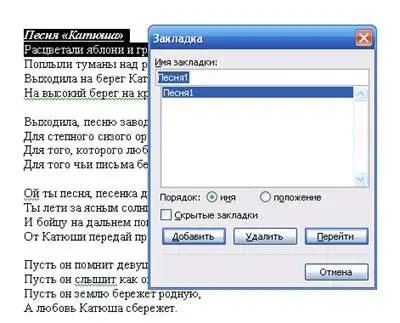 В поле Имя закладки удалите то, что там есть и введите имя закладки для выделенного текста (начинается с буквы, а не цифры), например, песня1. Щелкните по кнопке «Добавить».
