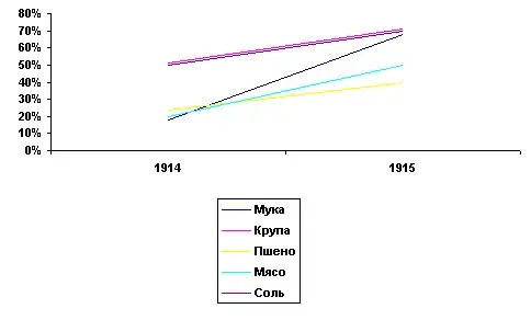 | Год | Мука ржаная | Крупа гречневая | Пшено, рис | Мясо (П сорт) | Cоль |