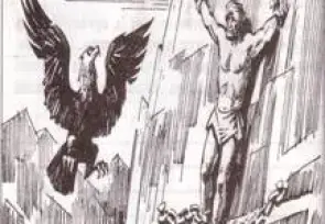 «Миф о Прометеи» (Некогда люди жили в темных пещерах, не знали огня, не умели разводить скот. Грозный Зевс решил истребить всех до единого. Никто не смел противиться Зевсу, но внук богини Земли Прометей посмел: спас людей от гибели… Он научил многому людей, похитил огонь в кузнеце своего друга бога Гефеста и принес его людям. Повелел Зевс Гефесту приковать ослушника цепями к дикому утёсу… Каждый день прилетал к утёсу орел и клевал его печень, а за ночь она отрастала вновь… Геракл застрелил орла, разбил оковы и освободил страдальца.)