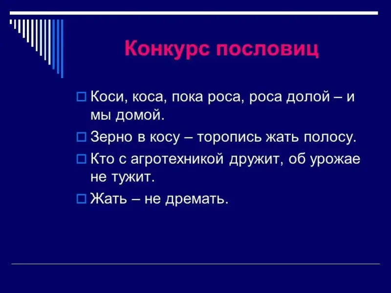 - Зерно в косу - торопись жать полосу.