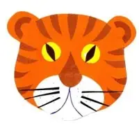 (цветной картон оранжевого цвета для основания - головы тигра, цветная бумага коричневого цвета для полосок и носа, черного цвета для глаз и усов, белого цвета для передней части мордочки)