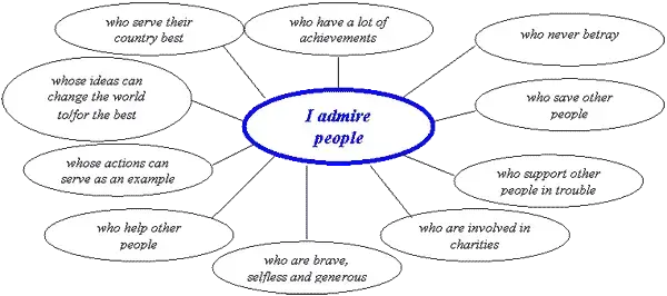IV. Следующий этап урока - составить схему (a word-web or a word-spider), которая помогла бы учащимся еще более полно рассказать о людях, которыми они восхищаются. Учащиеся высказывают свои предположения, кем с их точки зрения можно восхищаться. Учитель и учащиеся обсуждают все варианты, отбирают наиболее понравившиеся всем присутствующим и вписывают их в схему. Учитель заполняет эту схему на доске, учащиеся в тетрадях
