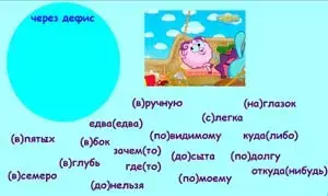 Рисунок 2 Слова, которые не пишутся через дефис, помещены на задний план. Если ученик это слово переносит на овал, то его не видно. При ошибке ученика учитель возвращается к предыдущей схеме, чтобы ученик сам понял, какую ошибку допустил. |