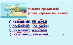 Ученики, анализируют представленный разбор наречий по составу, с помощью инструмента Выделенный элемент перетаскивают галочку к правильному ответу |