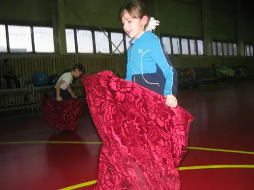 "Мешок с подарками". Встречная эстафета, каждая команда делится по 5 мальчиков и 5 девочек, и они организуют две колонны напротив друг друга. Первым участникам выдают широкие тканевые мешки для бега. Для удобства в мешки можно вшить легкие пластмассовые обручи диаметром 65 сантиметров, чтобы края мешков не заворачивались, и новому участнику было легче забраться в мешок. В результате этой встречной эстафеты мальчики и девочки поменяются местами - где стояли девочки окажутся мальчики и наоборот.