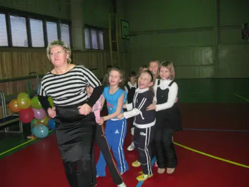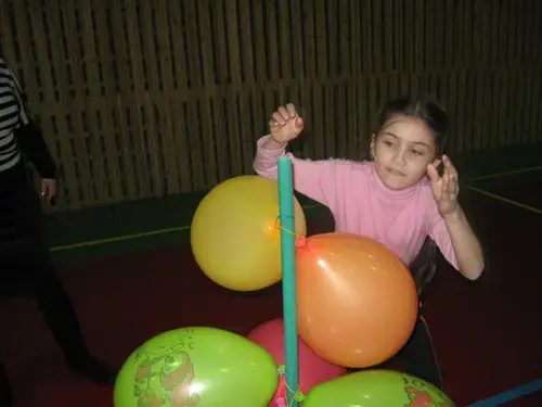 "Гирлянда". По залу в том месте, которое не используется для проведения эстафет, разбросаны воздушные шарики по количеству всех участников. К каждому шарику прикреплена резинка (такие резинки используются для упаковки денежных купюр). Если условия и размер зала не позволяют, шарики можно укрепить на стенах, в качестве дополнительного украшения. Ведущий предлагает по очереди каждой команде взять шарики. Все участники на одну руку (например, левую) надевают резинку с воздушным шариком, а другой (правой) все держатся за длинную скакалку. Команда должна пройти "змейкой" дистанцию, где установлены яркие кегли или резиновые мячи на подставках, и таким же образом вернуться обратно. Кто быстрее? "Отрываться" от скакалки-провода нельзя. Во время движения руку с шариком дети поднимают вверх.