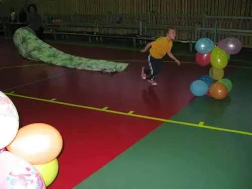 "Полоса препятствий". И, конечно же, нельзя забыть о "Полосе препятствий". Тем более что заключительным ориентиром теперь является настоящая елка из воздушных шариков. Сама полоса состоит из следующих заданий. Пропрыгать через низкую скамейку высотой приблизительно 25 сантиметров и длиной - 240 сантиметров (скамейка между ног); пролезть в обруч, закрепленный на стойке; выполнить кувырок вперед на гимнастическом мате; пролезть через тканевый тоннель; обежать ориентир - украшенную стойку и бегом вернуться обратно.