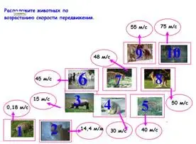 Учитель: поработаем с табличными значениями физических величин - «Скорости в животном мире» на рабочем листе, ранжируйте животных по возрастанию скорости движения, разместив карточки животных в секторах и записав числовые значения скоростей в окно, связанное с сектором.