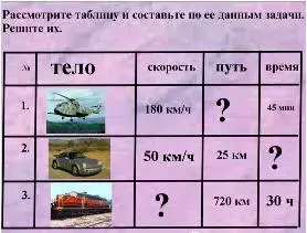 Учитель: мы с вами научились решать задачи. Для работы мы использовали разные сборники физических задач, в которых находятся условия качественных и расчетных задач. Следующее задание позволит вам стать авторами условия задач. Рассмотрите таблицу с недостающими значениями, составьте условие и решите задачи.