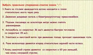 Учитель: мы с вами уже много знаем о движении - характеристики, их единицы измерения, расчетные формулы, виды, поэтому сможем разобраться в истинности утверждений. Выслушав утверждение, при необходимости перечитав, отметьте на листе выполнения заданий в таблице напротив номера утверждения знаком (+) правильное, а знаком (-) ошибочное.
