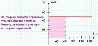 Ученик: 1 минута в система С.И. 60 секунд. По оси скорости определяем, что тело движется со скоростью 50 м/с. Чтобы найти пройденный путь, умножаем данные величины и находим, что