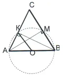 Проведем высоту АМ, тогда углы АКВ и АМВ равны по 900 , значит точки А, К, М, В лежат на одной окружности и АВ - диаметр.(На рисунке окружность изображена штриховой линией, хотя ее можно и вообще не изображать, а "представлять в уме") Точка О - середина АС по условию