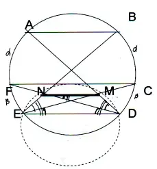Дуги, FЕ = СD = β (заключенные между параллельными хордами), значит вписанные углы< FDЕ = <CED = β/2 Они же являются вписанными углами для вспомогательной окружности, тогда дуга NЕ равна, дуге МD .<МЕD = <МN D = < N DЕ(накрест лежащие) значит МN¦ ЕD ║АВ. (рис. 5)