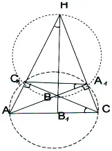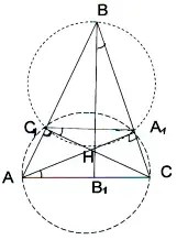 а) рассмотрим случай остроугольного треугольника. Проведем в треугольнике АВС высоты АА1 и СС1 и обозначим через Н точку их пересечения (рис. 8), а через точку