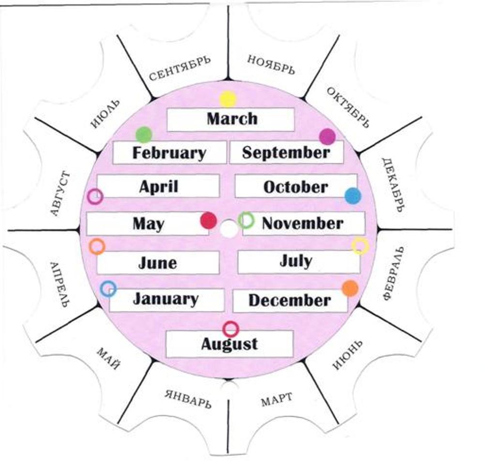 Teacher: It's time to check how you know the months. (Ребятам выдается ЛЕГО СПЕКТРА, где они сопоставляют русские и английские слова по теме) Месяца См. Приложение 1. Ребята работают в парах (2-3 минуты)