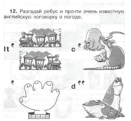 Teacher: Let's have fun. Please guess this puzzle (ребус It's rains cats and dogs) См. Приложение 3 (2 минут)