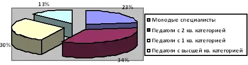 В 2009-2010 учебном году 32% - от общего числа педагогов составляют молодые специалисты, 17% - педагоги, имеющие 2 квалификационную категорию, 36% - имеющие 1 квалификационную категорию и 15% - высшую квалификационную категорию.