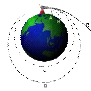 Анализ первой и второй космической скорости по Исааку Ньютону. Снаряды A и B падают на Землю. Снаряд C выходит на круговую орбиту, D - на эллиптическую. Снаряд E улетает в открытый космос.