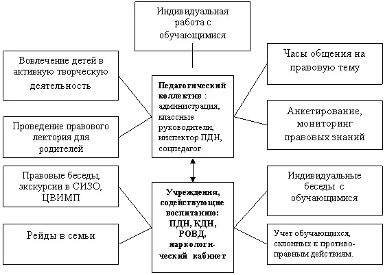 Обязательным условием является привлечение специалистов. Так, на родительских собраниях выступают инспекторы ПДН по работе с обучающимися (Потапова Я.Г.,Чижова О.В.), просвещая родителей в части ознакомления со статьями «Семейного кодекса» ст. 63 (Права и обязанности родителей по воспитанию и образованию детей), положением статьи 5.35 Нового кодекса РФ об административных правонарушеиях («Неисполнение родителями или иными законными представителями несовершеннолетних обязанностей по содержанию и воспитанию детей»). Майор милиции Грачева знакомит обучающихся со статьями Уголовного Кодекса РФ (Об ответственности несовершеннолетних за совершение противоправных действий). Врач-нарколог Скворцова Е.В. проводит не только антинаркотическую работу, но и предупреждает подростков об ответственности за приобретение, хранение и сбыт наркотических веществ.