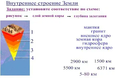 (Ответ: 1 - земная кора - 5-80 км ; 2 - мантия - 2900 км.; 3 - внешнее ядро - 5500км.; 4 - внутреннее ядро - 6371км)