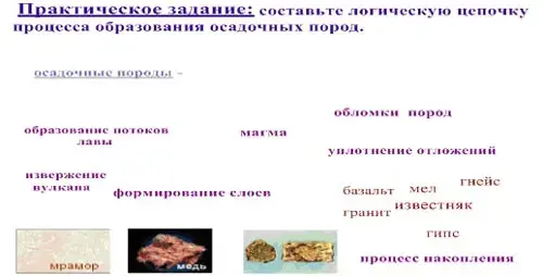 - учащиеся в тетрадях составляют схемы образования осадочных и магматических пород, работая с содержанием слайда.