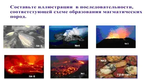 Учащиеся в тетрадях записывают цифры, соответствующие схеме образования магматических пород. Магматические породы - извержение вулкана - образование потоков лавы - магма - примеры: гранит, базальт