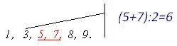 Выберем два центральных числа: 5 и 7. Найдем их полусумму: (5+7):2=6. То есть медиана данного набора есть число-6.