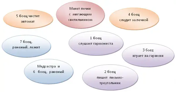 2 боец, пишущий письмо домой: Когда поэт писал стихотворение «Бьётся в тесной печурке огонь», он не предполагал его публиковать и тем более не думал, что оно может стать песней. Это были несколько стихотворных строчек письма жене с фронта. Написал их А.Сурков действительно в землянке, в «белоснежных полях под Москвой», в районе Истры, в конце ноября 1941 года под живым впечатлением очень трудного дня, когда ему- корреспонденту фронтовой газеты - пришлось вместе с штабом одной из гвардейских частей вести тяжёлый бой с гитлеровцами.