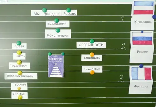 Оборудование: звуковая запись гимна РФ, иллюстрация герба России, флага России, текст гимна России, изображение флагов России, Франции, Югославии, Конституция РФ, карточки со словами Конституция, гражданин, права, обязанности, жить, трудиться, путешествовать, отдыхать, учиться, творить, защищать, тест.