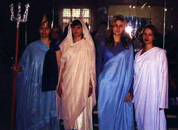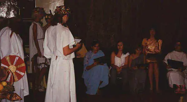 Зал помогает Гермесу рассадить богов, называя соответствия их греческих и латинских имён.