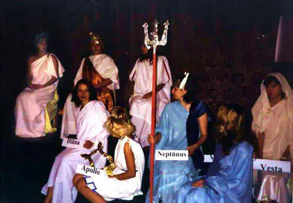 Костюмы богов-Олимпийцев, учителей и учеников греческой и римской школ, вагантов, врача; два телефонных аппарата; фонограмма песни "Во французской стороне"; фортепиано; копия древней карты Европы; доска и маркер.