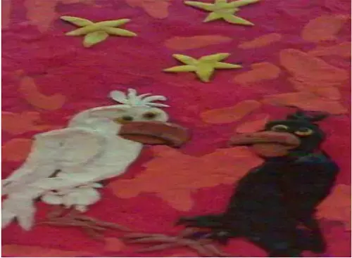 (Дети предполагают, что можно слепить фигурки, а потом расположить их на картоне. Возможно, кто-нибудь из ребят предложит выполнить рисунок пластилином. Если этого не говорят дети, то предлагает учитель).
