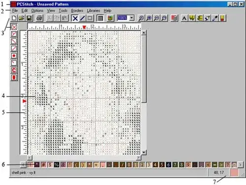 Основные элементы окна редактора PCStitch: 1 - строка заголовка; 2 - строка меню; 3 - панели инструментов; 4 - окно документа; 5 - линейка; 6 - палитра цветов; 7 - строка состояния.