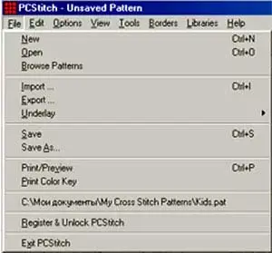 Open (Открыть) - открыть схему на диске. Позволяет открыть схему в формате *.pat из коллекции готовых схем программы или файлы созданные пользователем ранее, которые при желании можно отредактировать средствами графического редактора PCStitch.