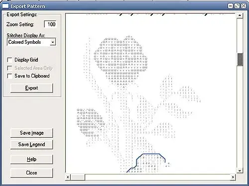 Export (Экспорт) вызывает диалоговое окно Export Pattern(рис.5), в котором следует установить масштаб (Zoom Setting), из раскрывающегося списка Stitches Display As (Отображать стежки как) выбрать один из предложенных вариантов: Colored Squares (Цветные квадраты), Colored Stitches (Цветные стежки), B&W Symbols (Символы), Colored Symbols (Цветные символы), Blocks & Symbols (Блоки и символы), Virtual Stitches (Виртуальные стежки). Здесь можно установить флажки: Display Grid (Отображать сетку), Selected Area Only (Только выбранная область) Save Clipboard (Сохранить в буфер) после чего нажать кнопку Export и в окне предварительного просмотра отобразится результат. Достигнув желаемого результата следует нажать кнопку Save Image (Сохранить изображение), затем кнопку Save Legend (Сохранить легенду). Появляется диалоговое окно Export a PCStitch Pattern в строке Папка выберите имя папки, в которую следует сохранить файл, в строке Имя файла введите имя файла и нажмите кнопку Сохранить.