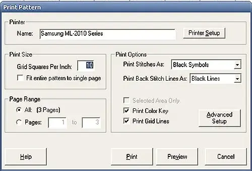 Далее можно установить необходимые флажки. Selected Area Only (Только выбранная область) в данном случае будет распечатана только заранее выделенная область схемы. Print Color Key (Печатать цветной ключ) будут распечатаны обозначения и номера ниток. Print Gird Lines (Печатать сетку схемы) для удобства работы со схемой желательно установить этот флажок.