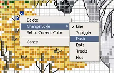 При распечатке схемы следует обратить внимание на то, что на схемах шов "Назад иголку" отображается разными цветами. Чтобы при печати не получить одинаковые черные линии, следует изменить вид этих стежков. Для этого нажмите правой кнопкой мыши на любой шов "Назад иголку" появится контекстное меню (рис. 7.), в котором выберите пункт Change Style (Изменение стиля) и подпункт с понравившейся линией. В этом случае при печати каждому цвету будет соответствовать свой вид линии.