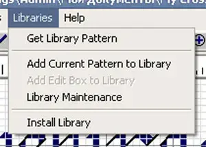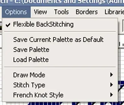 Load Palette (Загрузить палитру) - загрузить палитру цветов. Draw Mode (Способ рисования) дает возможность выбора способа рисования на схеме (стежки, линии, выделить область). Быстрые кнопки, соответствующие этим пунктам, находятся на панели инструментов. Stitch Type (Тип стежка) - позволяет выбрать тип отображения стежка (кресты, полукресты, 3/4 креста и т.д.). French Knot Style (Стили французского узелка) позволяет отобразить французский узелок различными способами с изменением наклона.
