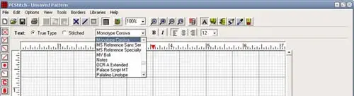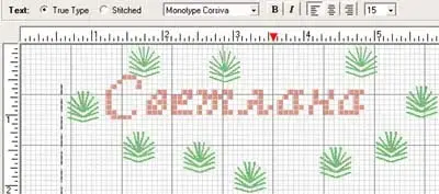 Text - ввести текст на схему (рис. 12). Чтобы были русские буквы, пользуйтесь русскими шрифтами, которые можно выбрать из раскрывающегося списка и установите флажок True Type. Если установить флажок Stitched, буквы будут печататься стежками, но к сожалению, только по-английски.