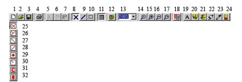 Условные обозначения: 1 - создать; 2 - открыть; 3 - сохранить; 4 - печать; 5 - вырезать; 6 - копировать; 7 - вставить; 8 - крест; 9 - шов "назад иголку"; 10 - выделить область; 11 сетка; 12 - палитра цветов; 13 - масштаб; 14 - масштаб определенной, выделенной области; 15 - увеличить; 16 - уменьшить; 17 - вернуться к прежнему масштабу; 18 - вставить образец из библиотеки; 19 - набор текста; 20 - вертикальные зеркальные кресты; 21 - горизонтальные зеркальные кресты; 22 - закрасить пустую область; 23 - пипетка; 24 - ластик; 25 - целые стежки; 26 - три четверти стежка; 27 - верхние полстежка; 28 - нижние полстежка; 29 - французский узел; 30 - четверть стежка; 31 - пользовательский стежок; 32 - цепочки.