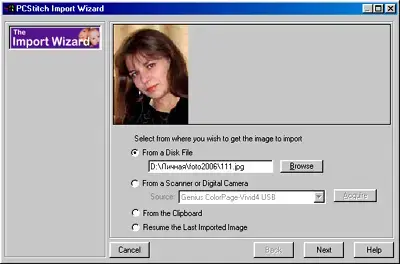 Import (Импорт) вызывает диалоговое окно PCStitch Import Wizard (рис. 4), которое позволяет создавать схемы из любого изображения: из файла, со сканера, камеры, планшета.